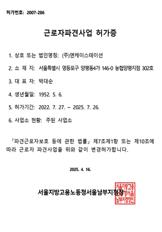 앤케이스테이션은 인력 운영 및 현장 관리 과정에서 요구되는 법적 요건과 제도적 기준은 물론, 예기치 못한 사고에 대비한 책임 이행 체계까지 갖추고 있습니다. 각종 인·허가와 보험을 기반으로 고객이 안심할 수 있는 안정적인 인력 서비스를 제공합니다.
